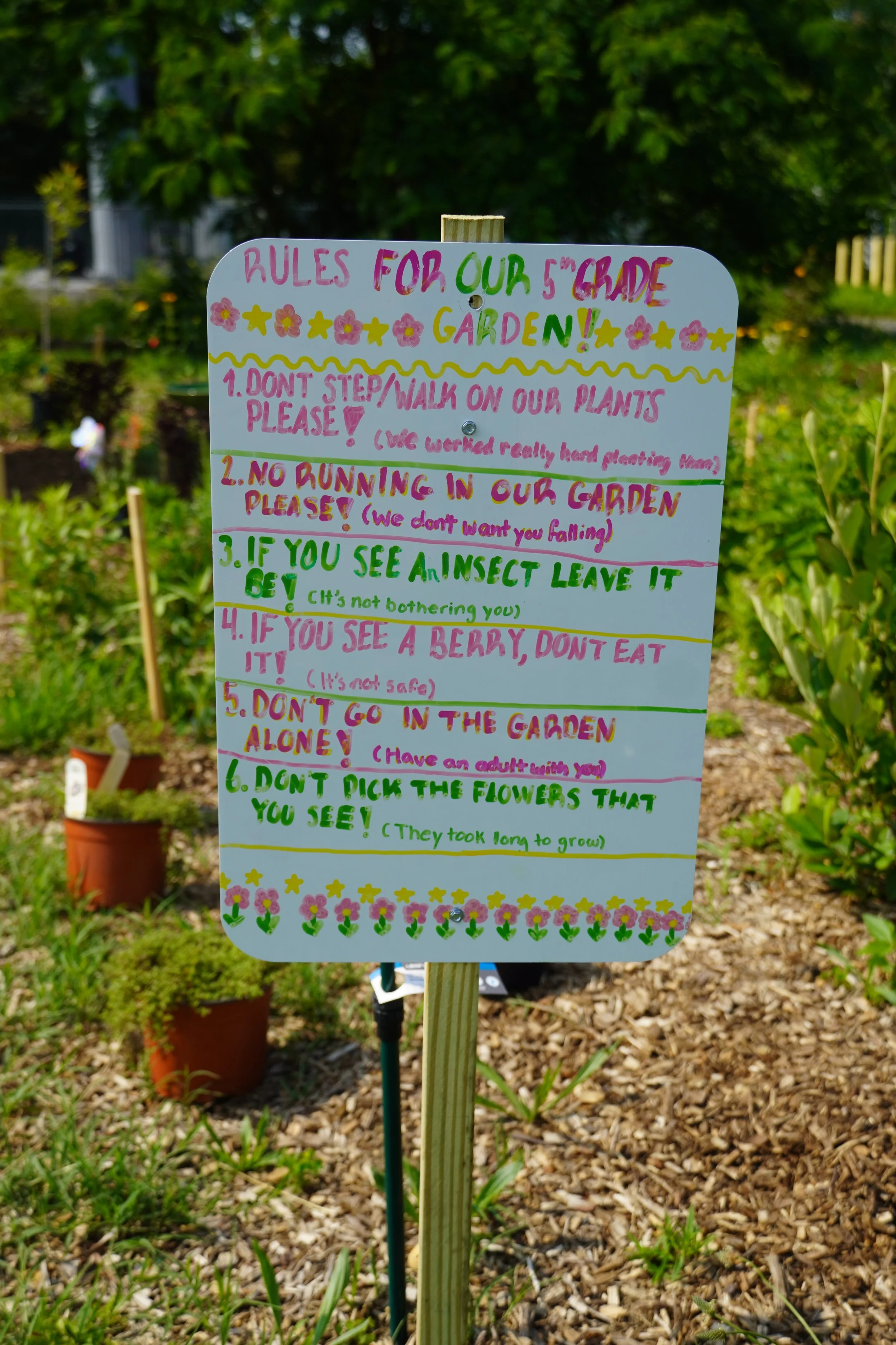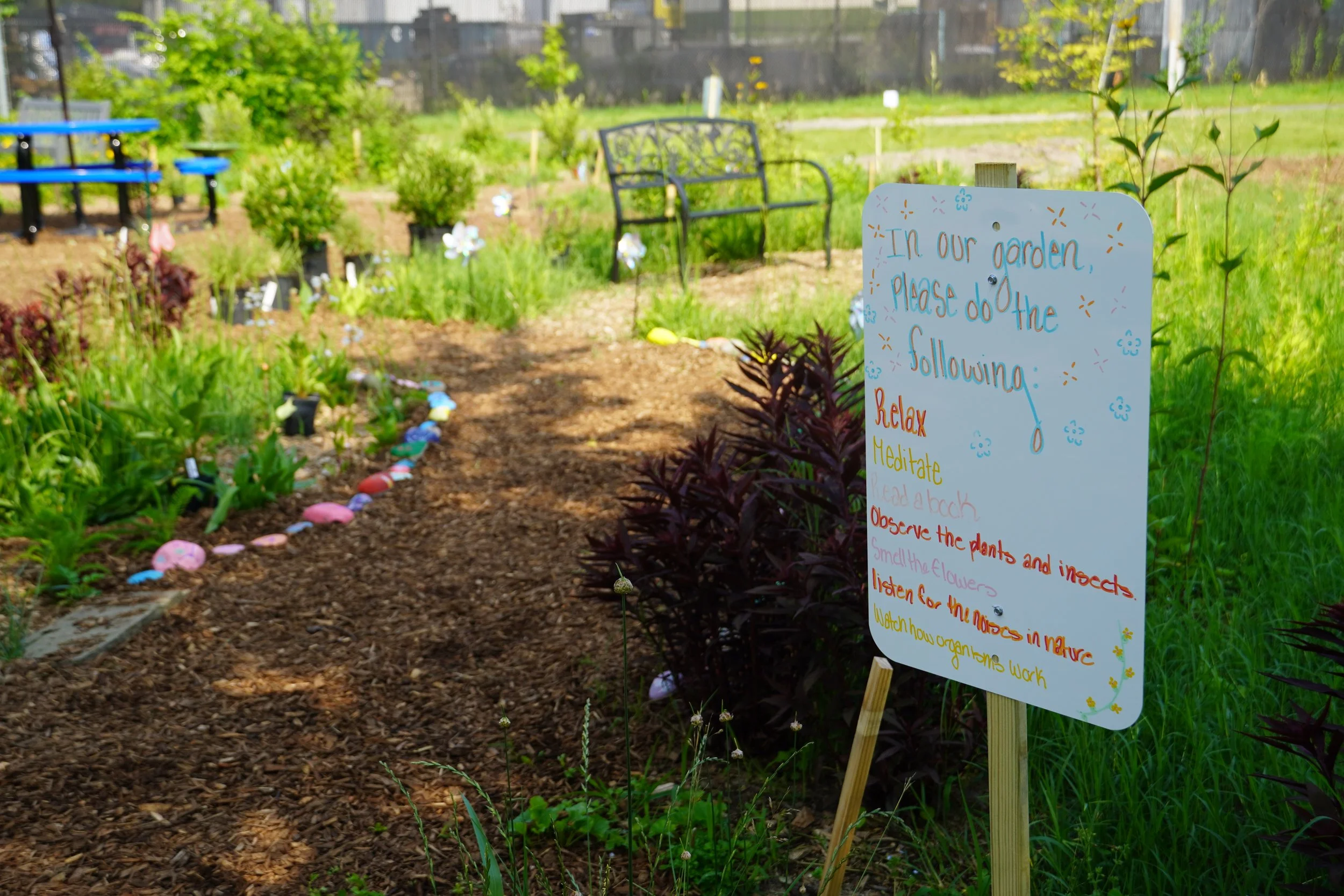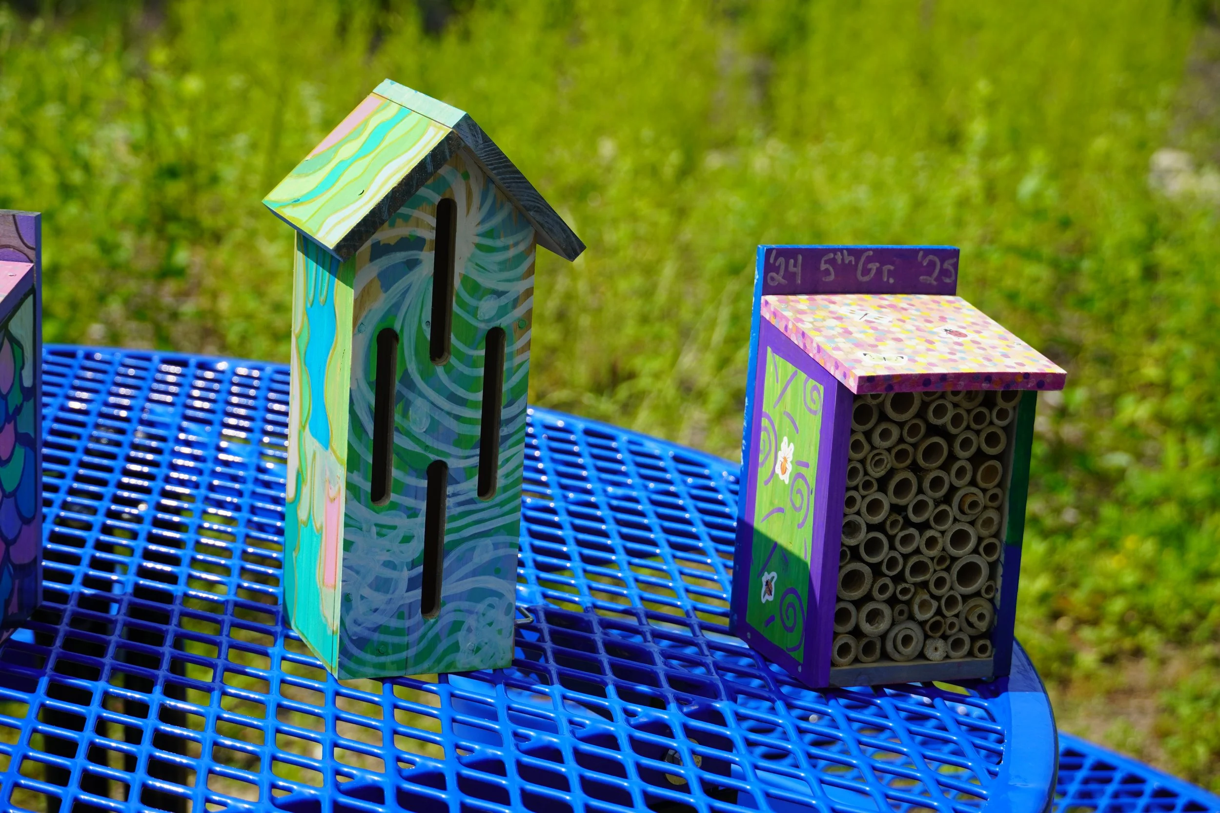 Elements: Solar-powered bird bath, picnic tables for outdoor classroom, hand-made signage, bird and bug hotels