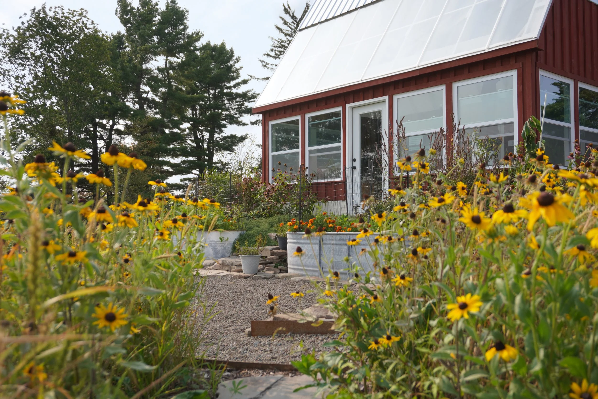 An old shed, now deconstructed, provided foundation stones for both the greenhouse and surrounding pavers. The greenhouse, situated near the farmhouse and barn, serves as a hub for seedling production, while the outdoor areas offer a welcoming gathering space for family and visitors.